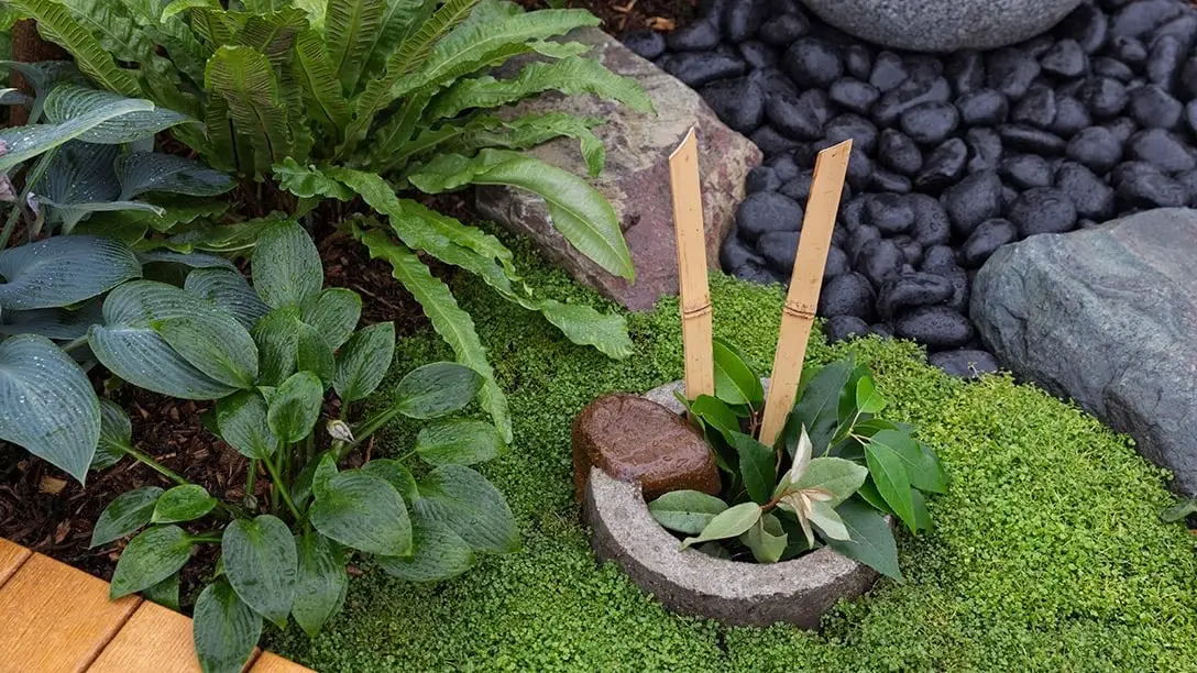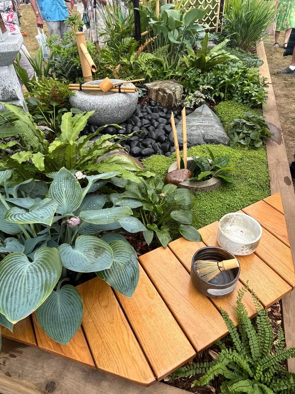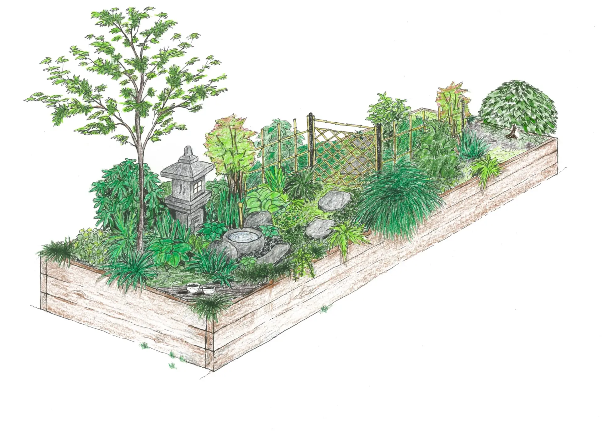 The border draws inspiration from a traditional Japanese Tea Garden, designed to promote calm and mindfulness before a tea ceremony. Guests follow a “dewy path” (Roji) over stepping stones through green spaces, entering through a bamboo gate into an inner garden with a stone basin for ritual cleansing and a Chiriana (ornamental dust pit) symbolizing letting go of worries. We reinterpret this journey virtually, enhancing the serene, symbolic experience. Planting features evergreens, minimal flowers, and shady areas. Moss is replaced with ground cover, bordered by hostas, ferns, grasses, and Camellia Sinensis. Varied greens, textures, and forms reflect a Japanese aesthetic and year-round interest.